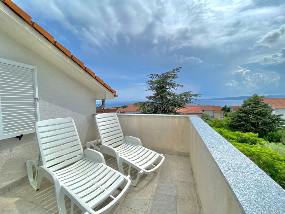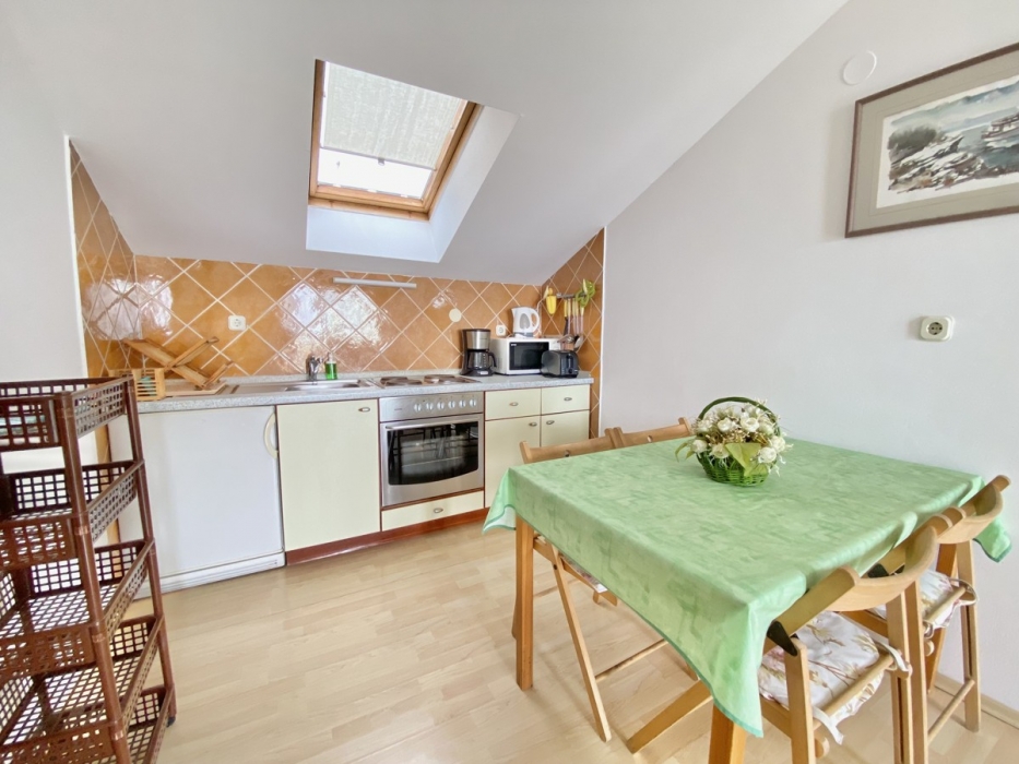 Apartment nr. 2 is located on the second floor, attic and it can accommodate 4 persons in 2 bedrooms. There is a possibility for situating 1 person in living room at sofa bed that opens out into a bed of size 130cm x 190cm.The kitchen is fully equipped with all necessary kitchen appliances. The bathroom is complete with standard appliance and includes a shower, bidet and washing machine. Guests have at their disposal 2 terraces with a sea view equipped with table, chairs and deck chairs. Smoking is allowed only outside the apartment, on the terrace/balcony.