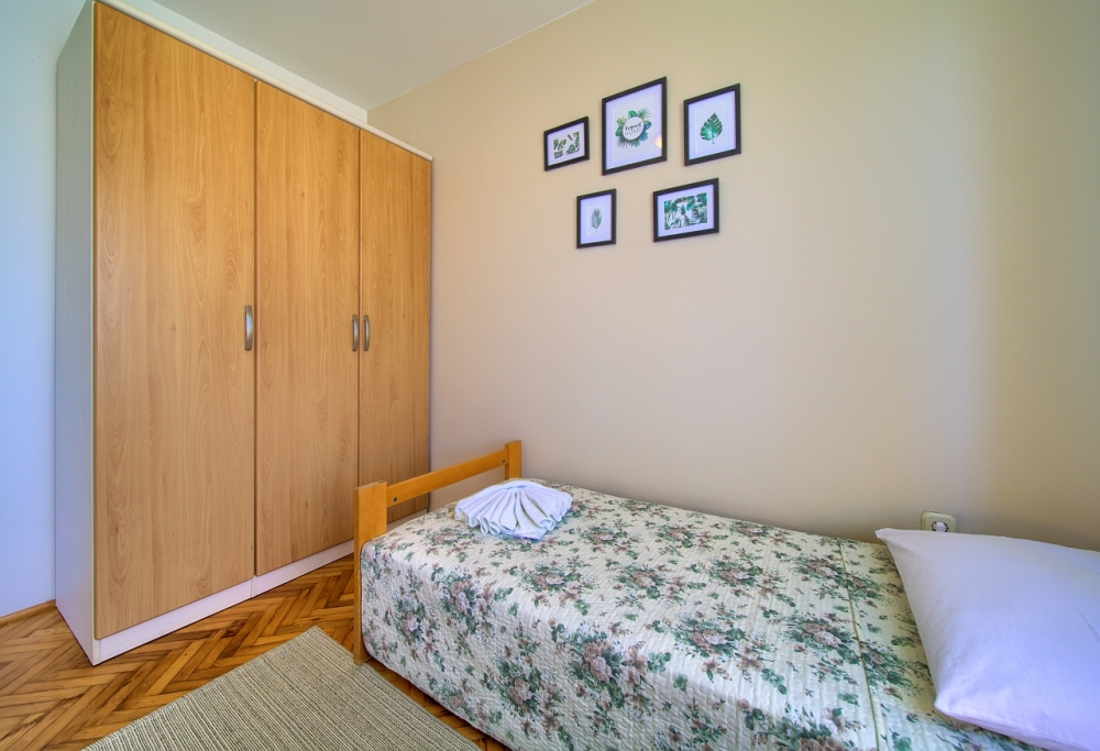 Apartment nr. 2 is situated on the first floor and it can accommodate up to 5 persons. Apartment consists of one double room and one room with two single beds that can be made into a double bed if needed. There is a possibility to accommodate one additional person at the living room pull-out sofa bed. The kitchen is fully equipped with all necessary kitchen appliances. The living room provides direct access to the furnished balcony with a sea view and equipped with table and chairs.