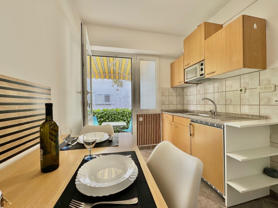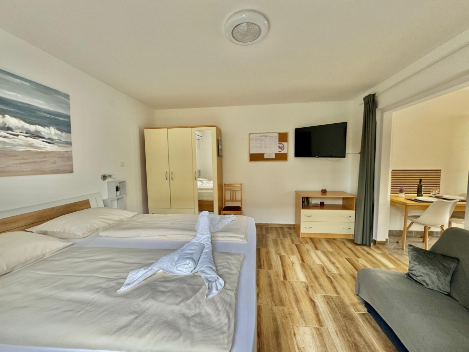 Apartment-studio nr. 2 consists of a bedroom with double bed (160cm x 200cm) and sofa bed of size 120 x 190cm. Kitchen is equipped with an electric cooker, refrigerator, coffee maker, toaster, kettle and all necessary kitchenware. The apartment has a lovely terrace equipped with garden garniture. Smoking is allowed only outside the apartment, on the terrace / balcony.