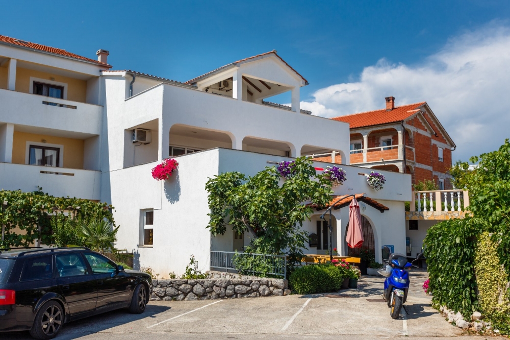 Apartment nr. 2 is located on the first floor and it can accommodate up to four persons. Apartment consists of a bedroom with double bed + single bed, bathroom with walk-in shower and living room with pull-out sofa bed (mattress made of firm polyurethane foam with cool gel memory foam). The kitchen is equipped with all necessary kitchen appliances and includes a microwave, oven, kettle and dishwasher. The living room provides direct access to the spacious balcony-terrace with a sea view.