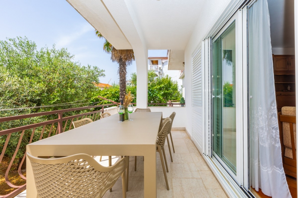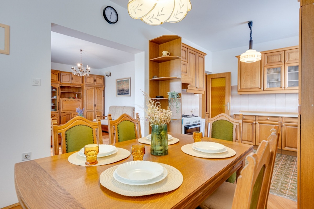 Apartment is situated on the first floor and consists of three bedrooms, living room and two bathrooms. Kitchen is equipped with an electric cooker with four hot plates, oven, refrigerator with freezer, coffee maker, kettle and all necessary kitchenware. There is a lovely terrace equipped with table and chairs.