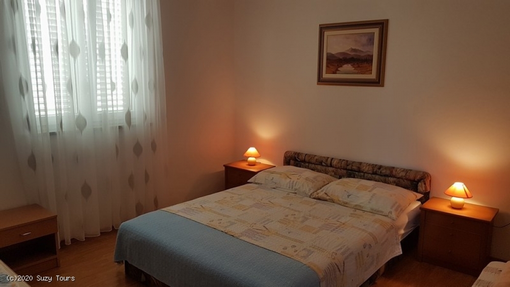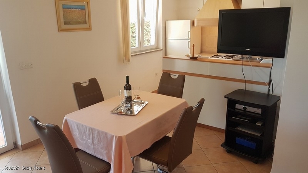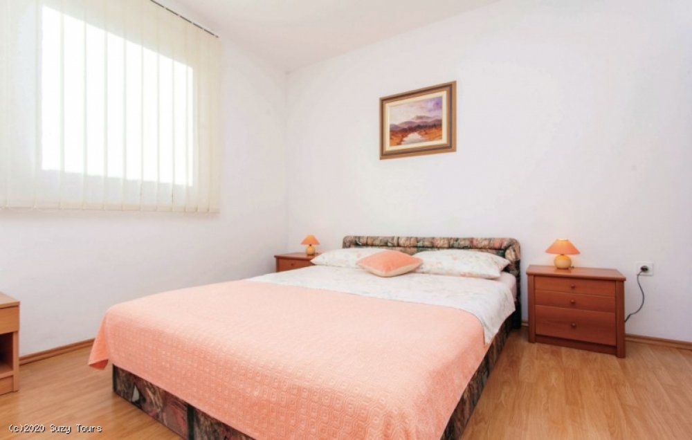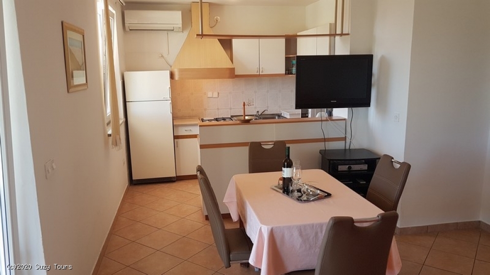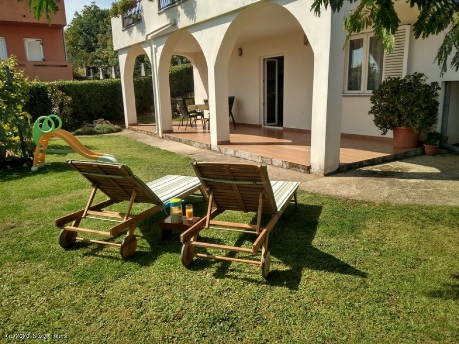 Apartment 4+1 is situated on the ground floor and provides ideal accommodation for five persons. Apartment consists of a living room and two bedrooms. Kitchen is equipped with an electric stove, refrigerator, coffee machine, microwave, kettle, toaster and all necessary kitchenware. The most interesting feature is its covered terrace surrounded by lovely private garden and rich mediterranean vegetation. Smoking is allowed only outside the apartment, on the terrace/balcony.