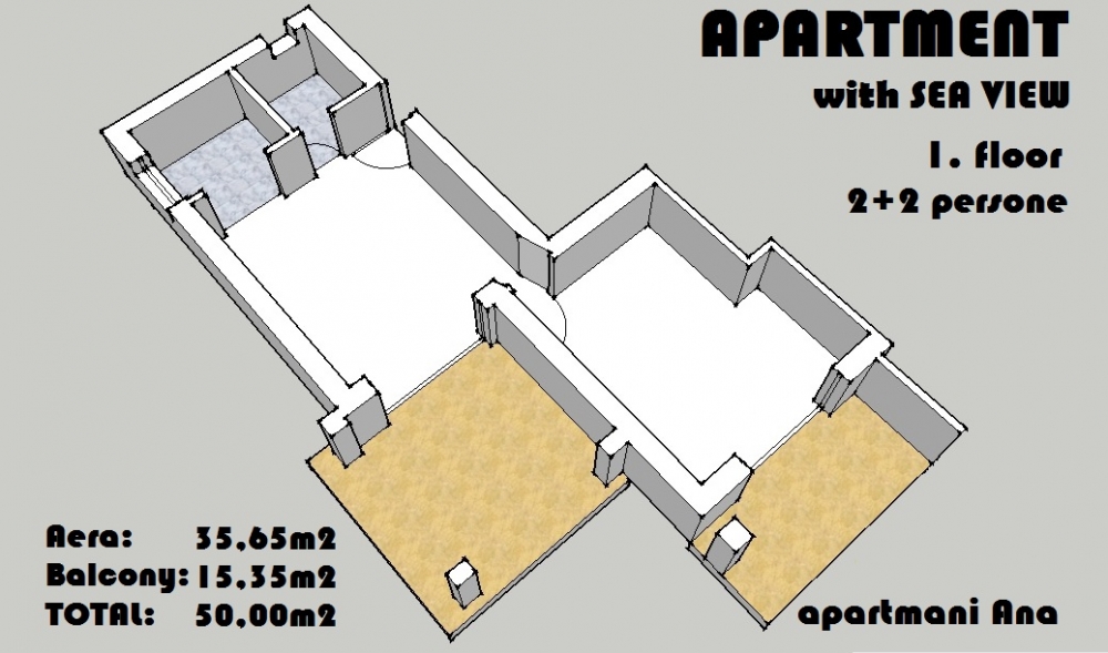 Apartment nr. 3 is situated on the first floor and with a total area of 40 square meters, the apartment provides ideal accommodation for 2 persons. Upon request a folding bed can be placed in the bedroom for an additional guest. Kitchen is equipped with an electric stove, refrigerator and all necessary kitchenware. The living room provides direct access to the furnished balcony with a partial sea view. Smoking is allowed only outside the apartment, on the terrace/balcony.