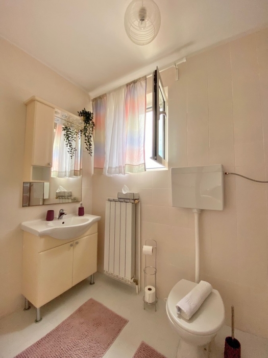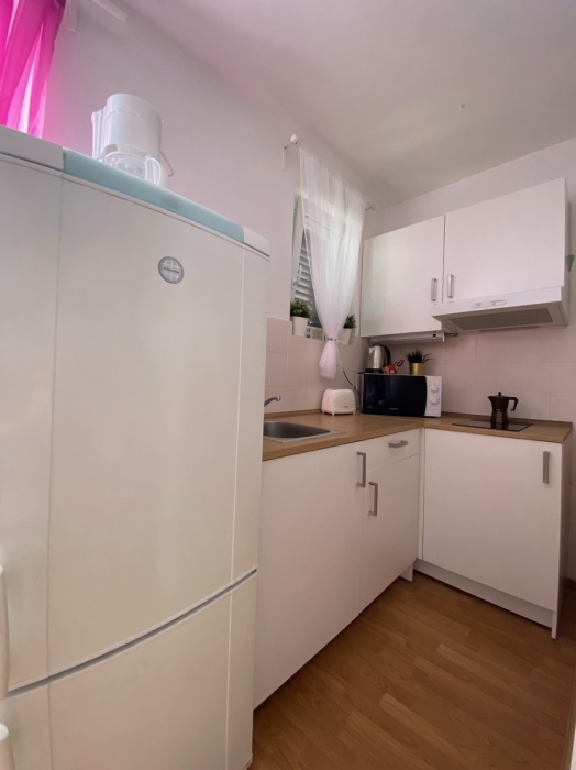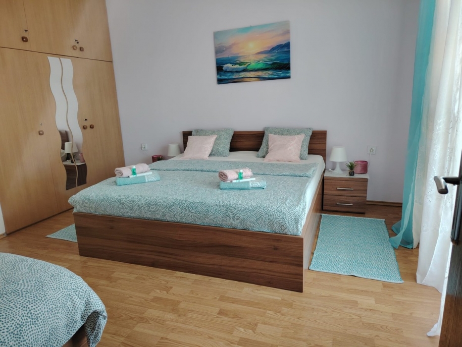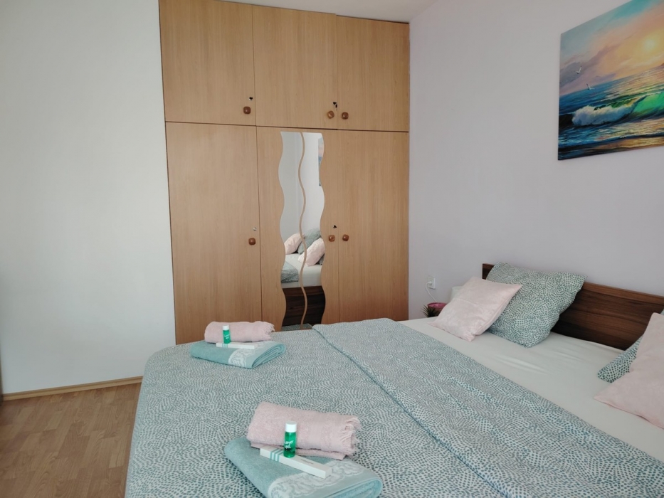 Apartment consists of a bedroom with double bed and single bed, living room with pull-out sofa bed and the kitchen is equipped with an electric stove, refrigerator, microwave and all necessary kitchenware. The bathroom consists of a bath tub and sink. The bedroom provides access to the furnished balcony with a partial sea view and is equipped with table and chairs.