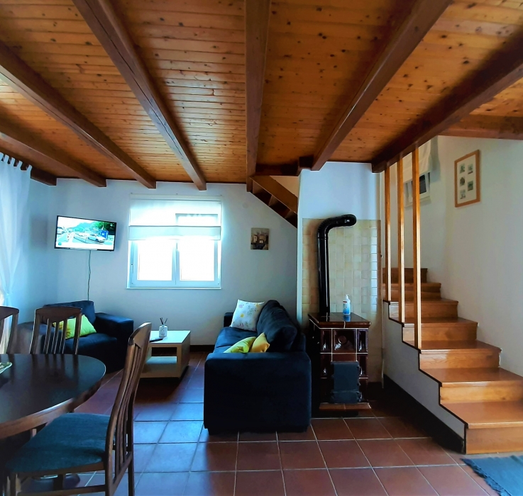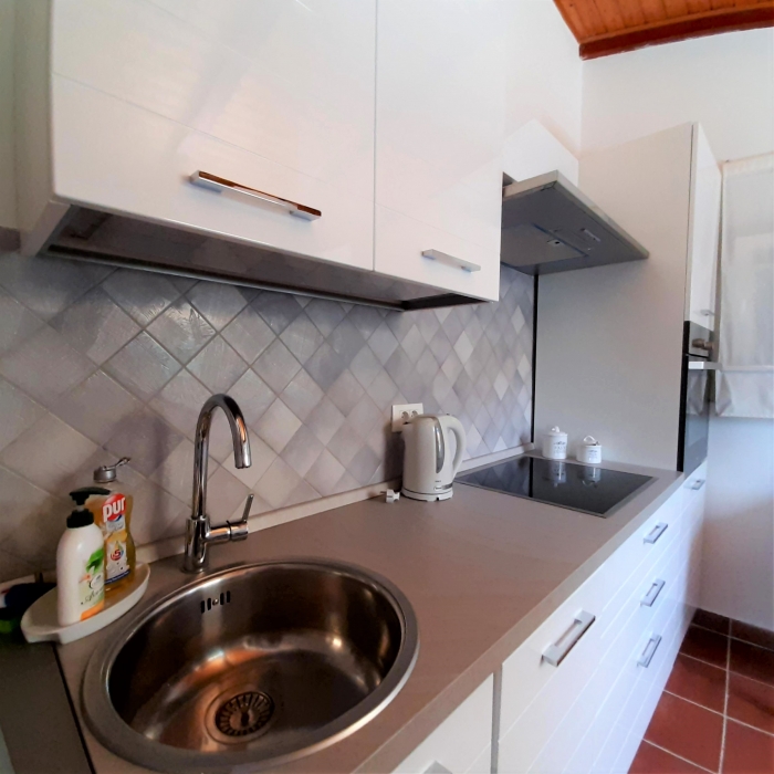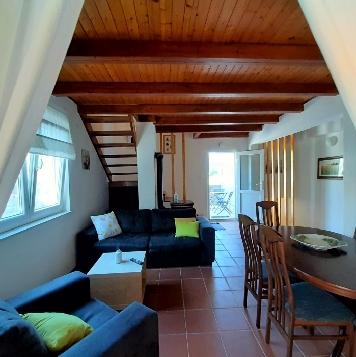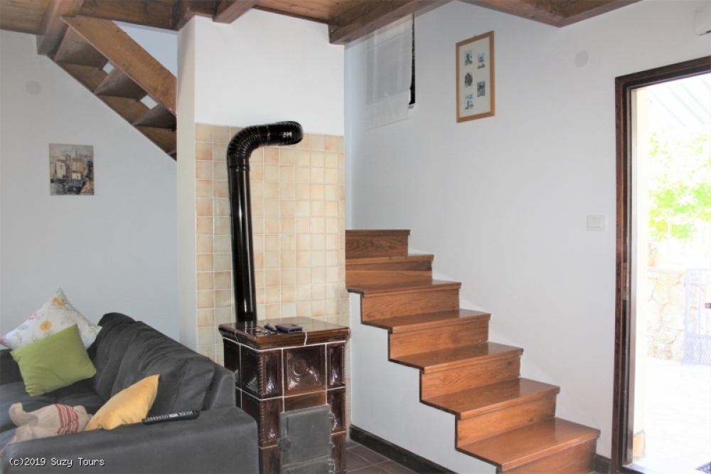 The house spreads over two levels. The ground floor consists of a fully equipped kitchen and living room. Few stairs lower is a bathroom with shower and bedroom equipped with two single beds that can be made into a double bed if needed. The living room provides direct access to the terrace equipped with a table and chairs. The first floor attic consists of a spacious air conditioned bedroom with one double bed and two sofa beds. The living room provides direct access to the shady terrace equipped with a table and chairs.