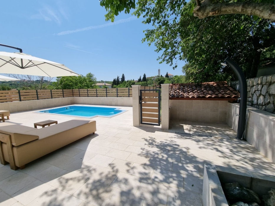 The house is situated in the village Vrh and its ideal location puts you within 10 minutes drive from the city of Krk. In this newly renovated countryside house you will find a charming and comfortable apartment with a fenced garden, barbecue, sun loungers, garden pavilion and an own heated saltwater swimming pool.