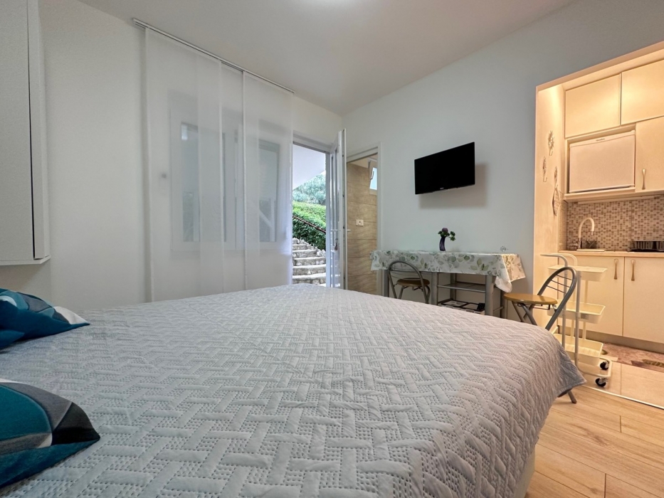This pleasantly furnished lovely studio is fully equipped and intended only for two people. Double bed, kitchenette and dining table, all in one space, and a covered terrace is equipped with a table and chairs and an electric grill.