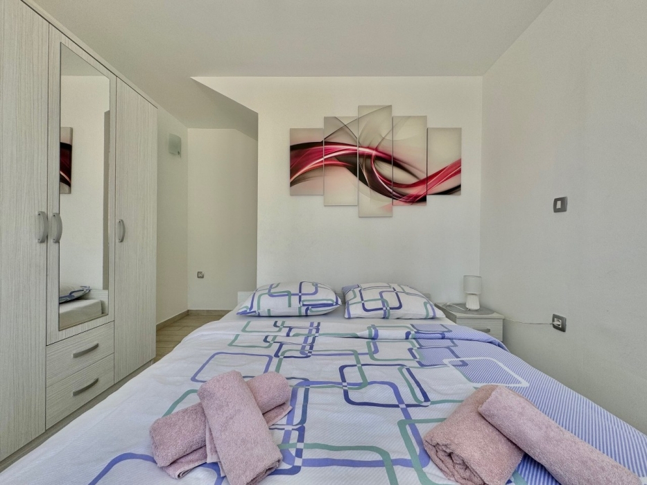 Apartman se sastoji od jedne dvokrevetne spavaće sobe. Dnevni boravak opremljen je sofom na razvlačenje (130 cm x 190 cm), prikladnom za jednu osobu. Potpuno opremljena kuhinja uključuje električni štednjak, hladnjak, aparat za kavu, mikrovalnu pećnicu, toster i sav osnovni kuhinjski pribor — sve što vam je potrebno za ugodan boravak. Kupaonica je opremljena modernim sadržajima, uključujući tuš, umivaonik i WC.