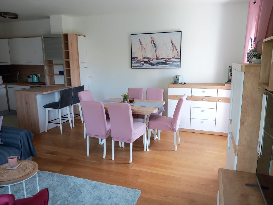 La cucina moderna e completamente attrezzata è adatta anche per soggiorni prolungati – dispone di lavastoviglie, forno, piano cottura, frigorifero con congelatore, macchina da caffè, bollitore elettrico, tostapane e tutti gli utensili da cucina necessari. L’ampia zona pranzo e soggiorno comprende un tavolo da pranzo, un divano e una TV con canali satellitari.